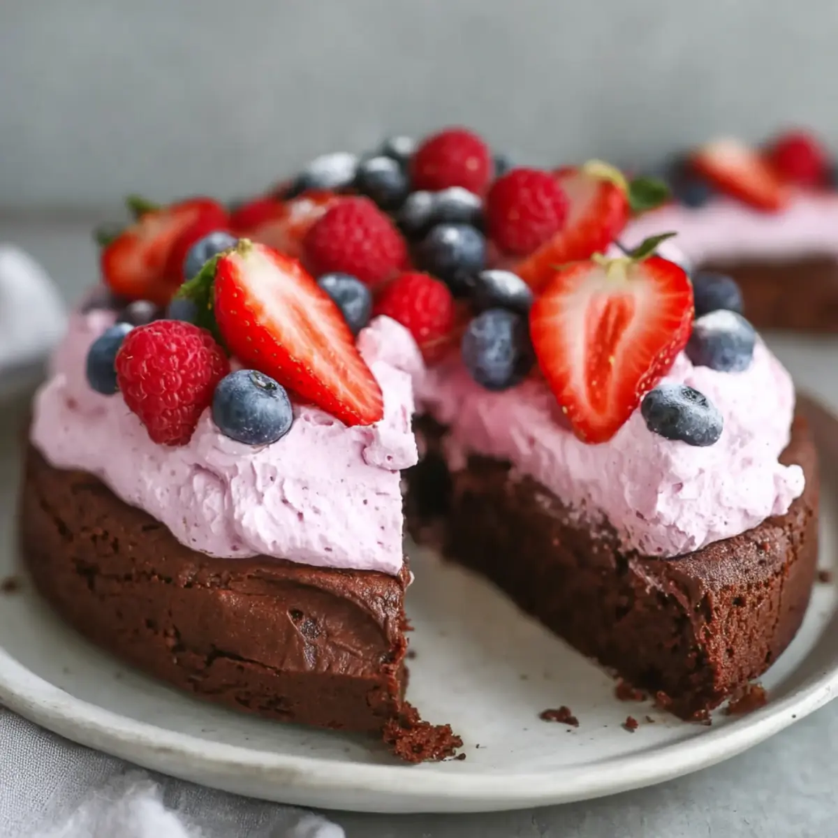 8. Den gekühlten Brownie mit der Himbeerschaum-Masse bestreichen und nach Belieben mit frischen Beeren dekorieren. Vor dem Servieren nochmals kühlen.