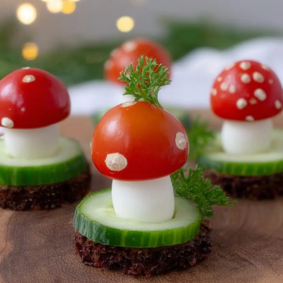 - tomaten – Besonders kleine, süße Mini-Tomaten sorgen für die leuchtend roten „Pilzkappen“ und frische Fruchtnoten.