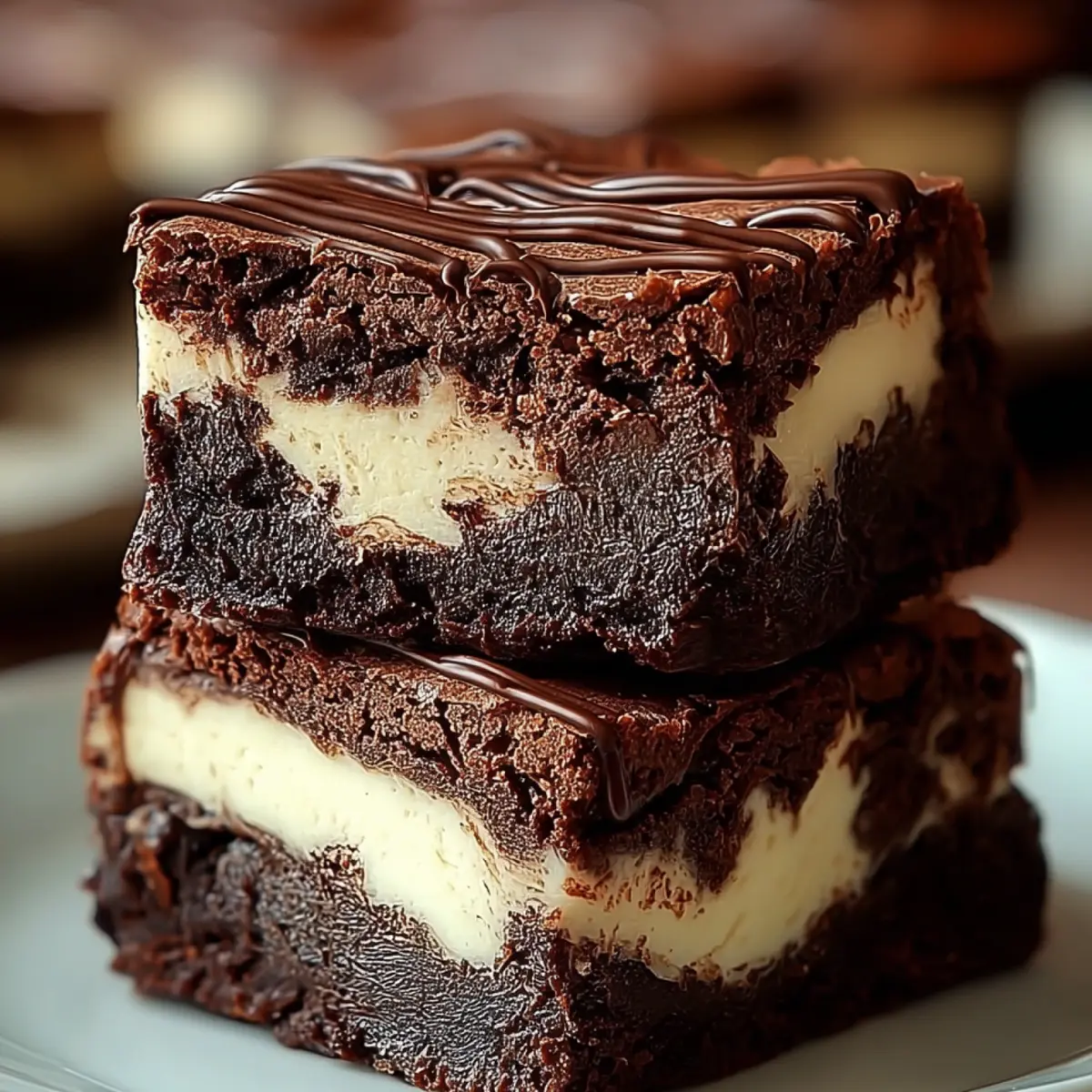 Was ich an diesem Rezept liebe, ist die absolute Einfachheit – und das Resultat, das aussieht wie aus einem angesagten Café. Die Frischkäse-Schicht wird sanft marmoriert, sodass jede Portion ein kleines Kunstwerk wird. Frisch aus dem Ofen duften sie nach Schokolade und Vanille und verführen dich schon beim Anschneiden, einfach ein Stück zu naschen.