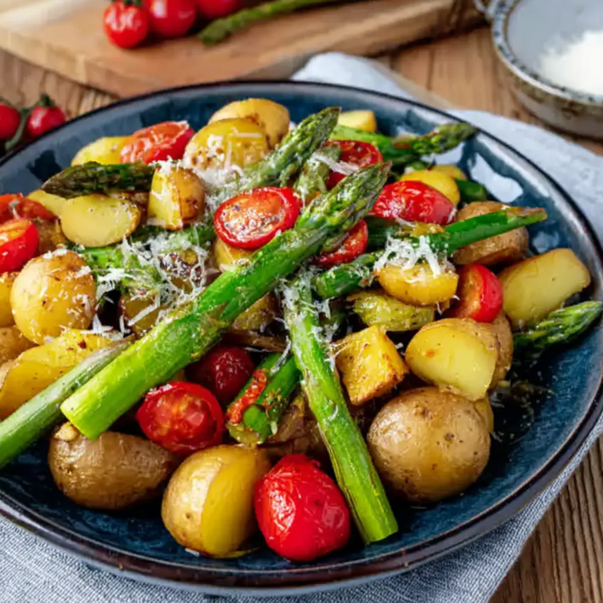 Kartoffeln, Spargel und Tomaten bilden die Basis – aber bei Bedarf kannst du locker etwas variieren. Für eine andere Kartoffelsorte nimmst du einfach festkochende (vorzugsweise mit dünner Schale), statt Cocktailtomaten funktionieren auch normale Tomaten, in Stücke geschnitten, oder eine Handvoll Kirschtomaten.