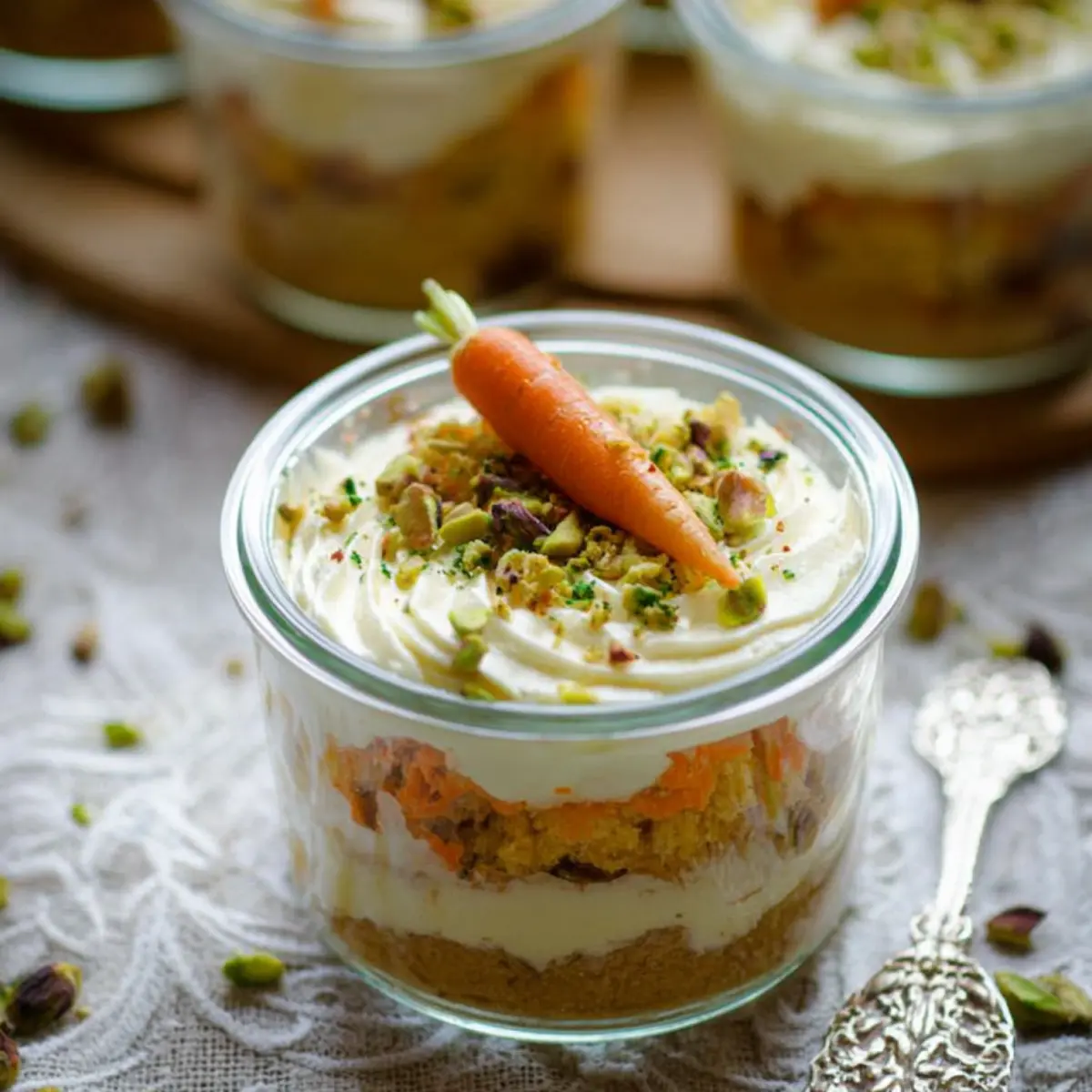 Karottenkuchen geht immer – klar. Aber wenn du ihn als Karottenkuchen im Glas servierst, bekommt das ganze einen Hauch von Besonderheit (und ein bisschen Show-Effekt am Tisch). Dieser Nachtisch ist nicht nur fluffig und saftig, sondern auch optisch ein echter Hingucker: Kleine Schichten aus Kuchen und Creme wechseln sich ab, bis ganz oben Pistazien und Mini-Möhrchen alles vervollständigen.