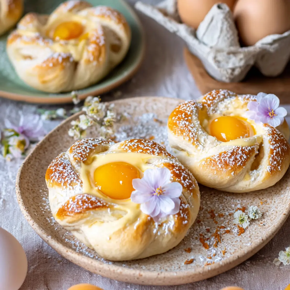 Für das typische Nest-Design rollst du kleine Teigstränge, zwirbelst sie miteinander und formst daraus Kreise, die außen um einen ausgestochenen Fladen liegen. Nach dem Bestreichen mit Eigelb und Milch glänzt das Gebäck verführerisch und bekommt im Ofen die perfekte goldene Farbe.